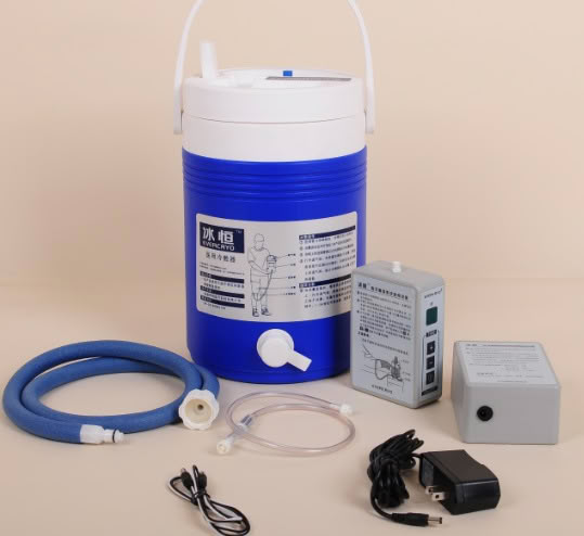 运动损伤后,骨科术前术后,循环冷敷加压,减轻肿胀,疼痛,炎症及感染病人的物理降温 使用方法 1、连接管与冰桶相连,冰桶内加入冰块和水,将锡箔垫放置于冰水混合物上面(冰水混合物为0℃)。 2、先把冷敷用隔离垫置于患处,再把冰囊固定在冷敷部位。(本产品标识朝外) 3、冰桶上的连接管通过止水阀接头与冰囊连接,关闭通气阀,拧紧冰桶盖,并放置冰桶低于冰囊(1500px以内)。 4、空气导管一端与循环泵相连,带有单向阀的一端与冰桶盖上的蓝色接头相连,电源线与泵的底部相连,并连接电源插座。调整选择自动循环脉冲加压时间(20—90秒),按下循环泵上ON/OFF键,循环泵开始运行。 ?产品操作说明:10个不同部位冰囊,满足临床各科室冷敷需求 膝,肩,踝,肘,小腿,大腿,手腕,背、髋、肋,头,颈。按人体解剖学原理设计,和冷敷部位紧密贴合冷敷和加压相结合,全新的冷敷设备使用中不影响患者的行动,使用方便,护理人员易于操作。该冷敷器大大优于其他冷敷方法。其治疗收费已进入《全国医疗服务价格项目规范》 ? ? 更多 医用冷敷器 价格、说明、厂家,请关注医贸天下医疗器械网