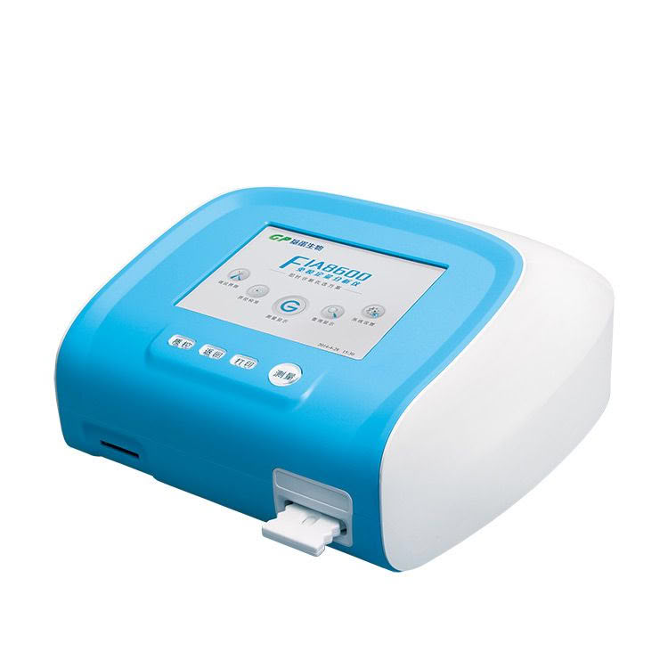 FIA8600免疫定量分析仪配套基蛋生物科技股份有限公司胶体金法的专用试剂盒,可体外定量检 测人血清、血浆、全血或尿液中心肌肌钙蛋白I、N-端脑利钠肽前体、全量程C反应蛋白(hs-CRP+常规CRP)、高敏C反应蛋白、肌红蛋白、肌酸激酶 同工酶、D-二聚体、降钙素原、微量白蛋白、胱抑素C、β2-微球蛋白、中性粒细胞明胶酶相关脂质运载蛋白、心型脂肪酸结合蛋白、糖化血红蛋白、绒毛膜促性腺激素及β亚单位的含量,检测结果用于临床辅助诊断。