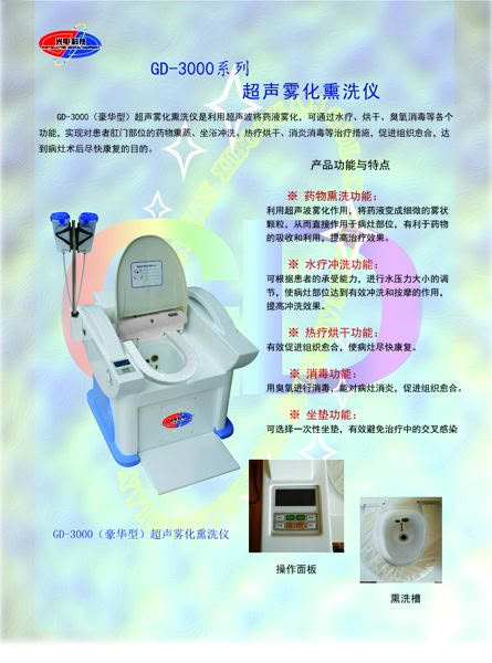 GD-3000超声雾化熏洗仪是由山东淄博光电医疗仪器有限公司生产的产品。该产品适用于各医疗单位的肛肠科、外科。超声雾化熏洗仪是利用超声波通过高频磁场将水或药液离子化,利用药离子促进组织对药物的吸收,通过雾化和熏蒸及冲洗的方法作用于患者肛门部位,达到治疗治疗。 产品主要功能介绍 1.药疗功能:用药液和药离子对病灶进行冲洗,达到给药治疗目的。 2.雾疗功能:用细微的药离子对病灶进行渗透,促进病灶对药物的吸收。 3.冲洗功能:用水/温水对病灶进行冲洗和按摩,促进伤口愈合。 4.热疗功能:用红外热风对病灶进行照射和辐射,促进伤口愈合。 5.蓝氧功能:用蓝氧(臭氧)对病灶进行辐射,消炎和治疗,促进伤口愈合。 6.工作模式:预热,自动/手动,雾疗、臭氧、药疗、热疗。 更多 超声雾化熏洗仪 价格、说明、厂家,请关注医贸天下医疗器械网