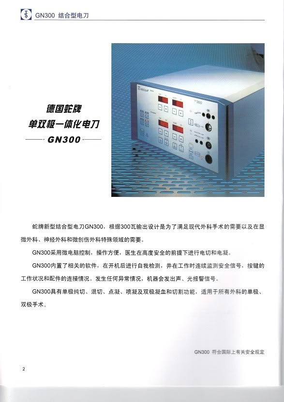德国 德国蛇牌高频电刀全国总代理 GN300高频电刀 GN300是函盖多种术式适合全科室使用的多功能电外科工作站 蛇牌特有专利功能 双极电切 、 允许在安全的双极模式下进行敏感组织的切割、分离 比例输出 依据脚踏开关灵活调节功率的输出,简化操作,缩短手术时间 记忆功能 同时记忆4组工作状态 氩气刀插座 可结合控制器升级成为氩气工作站 输 出 特 性 双刀笔输出 、双极电切,单极电切、双极内窥电切功能 、 输出功率0~80W 具有两种电凝效果 、柔和电凝、强力电凝、双极电凝功能 、输出功率0~80W 自动电切 具有自动电压控制的单极切割 适用范围:普外手术、妇科手术、骨科手术、耳鼻喉科手术、胸手术、神经外科手术、 显微外科手术、泌尿外科手术(包括前列腺电切和宫腔电切) 一、 切割模式(ATUO CUT):1.纯切模式(1)1~300W 2.混切模式(2)1~250 W 3.混切模式(3)1~200 W 4.混切模式(4)1~150 W 二、 双极电凝模式1. 双极电凝1~80 W 2. 单极电凝 1~120 W 三、双极电切功能1~80 W 四、存储功能 更多 蛇牌单双极一体化电刀GN300 价格、说明、厂家,请关注医贸天下医疗器械网