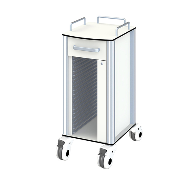一、产品名称 SKR719 病历夹车 二、产品参数 规格:380*400*1025mm 三、产品优势 1、整体采用抗倍特板制作,优异的稳定、持久、耐水、耐湿、耐热、耐侯、耐药、耐磨、耐冲击和易清洗维护等特性,外形美观。 2、采用三层主体结构设计,由台面、抽屉、病例夹存放区组成。台面左、右、后三面有不锈钢围栏,采用不锈钢圆管经专用弯管机弯制成型,圆弧角过度,美观大方,防止器械或药品掉落。台面下有一个抽屉,配优质静音滑轨,抽拉流畅顺滑,有效解决抽屉抽拉过程中容易滑出或阻滞的问题,抽屉可轻松取出。抽屉内采用模块化自由分隔式插片,可纵向横向任意组合分隔。 3、病历夹存放区共25格,每格病历夹存放位置均有相对应的标识序号,与相应的病历夹一一对应,避免发生错乱或查找不便,节约时间,提高工作效率,标识数字清晰、易于辨识;病历夹滑道抽拉自如,无阻滞感。 4、病历夹:ABS材质,无毒无异味、强柔韧性、耐用抗摔,可提供多种颜色供选择。 5、配医用静音万向脚轮4只,推动灵活、轻便,转向顺畅、准确,耐磨,耐药性好,带对角刹车,可随时随地在任意状态下轻松制动。 6、框架采用双T型槽铝合金型材,表面采用时效硬化工艺,强度高,重量轻,承重量大,整车稳固不变形,耐磨、抗腐蚀,外形美观精致。 更多 SKR719 病历夹车/病人推车 价格、说明、厂家,请关注医贸天下医疗器械网
