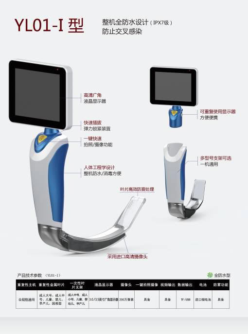 麻醉视频喉镜 YL01-I产品简介名称:麻醉视频喉镜 品牌:安视达产地:江苏 泰兴 型号:YL01-I产品特征 优势:一台主机可同时选配重复性使用镜片及一次性镜片,镜片规格型号齐全!整机全防水设计(包含显示屏可以深水浸泡消毒)IPX7级安全性:物理防雾设计喉镜片- 人体工学设计手柄可重复使用的镜片- 304医用不锈钢材质 - 可深水浸泡消毒一次性镜片采用灭菌包装提高使用安全,可防止交叉感染200万像素CMOS摄像头 支持拍照摄像 - 声门清晰可见便捷:重量轻, 便携式,快速安装和拆卸喉镜片高清:3.0英寸显示屏-支持外接大显示屏经济:304医用不锈钢镜片可重复性消毒使用 快速:可快速更换多种规格喉镜片- 开机即可插管适用科室:麻醉科、ICU、 手术室、呼吸科、急救中心、救护车、急诊、儿科等预期用途:供医疗机构在麻醉机构抢救时导入气管插管用麻醉视频喉镜 YL01-I产品简介名称:麻醉视频喉镜 品牌:安视达产地:江苏 泰兴 型号:YL01-I产品特征 优势:一台主机可同时选配重复性使用镜片及一次性镜片,镜片规格型号齐全!整机全防水设计(包含显示屏可以深水浸泡消毒)IPX7级安全性:物理防雾设计喉镜片- 人体工学设计手柄可重复使用的镜片- 304医用不锈钢材质 - 可深水浸泡消毒一次性镜片采用灭菌包装提高使用安全,可防止交叉感染200万像素CMOS摄像头 支持拍照摄像 - 声门清晰可见便捷:重量轻, 便携式,快速安装和拆卸喉镜片高清:3.0英寸显示屏-支持外接大显示屏经济:304医用不锈钢镜片可重复性消毒使用 快速:可快速更换多种规格喉镜片- 开机即可插管适用科室:麻醉科、ICU、 手术室、呼吸科、急救中心、救护车、急诊、儿科等预期用途:供医疗机构在麻醉机构抢救时导入气管插管用 更多 麻醉视频喉镜YL01-I 价格、说明、厂家,请关注医贸天下医疗器械网