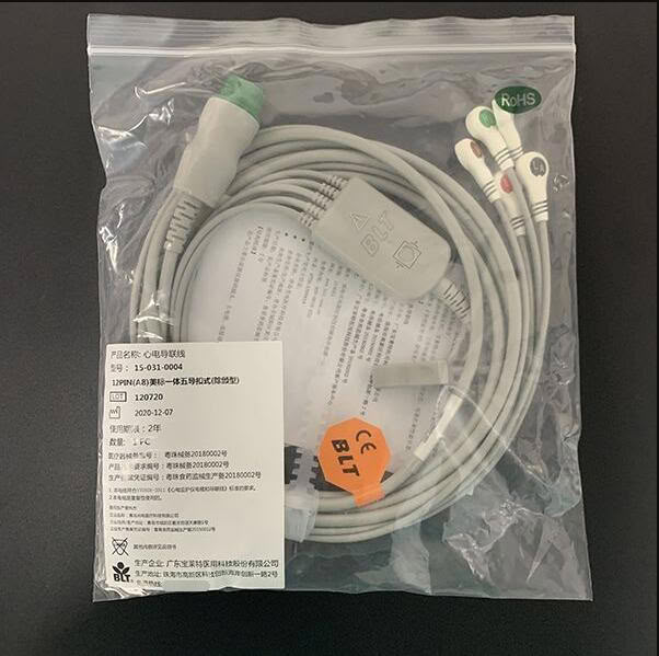产品名称:宝莱特心电导联线BLT原装一体五导美标AHA(棕V、白RA、红LL、黑LA、青RL)按扣式 心电线 A/Q系列加密监护仪通用绿色圆头小卡口内凹12针 针头小 编码:M0202471