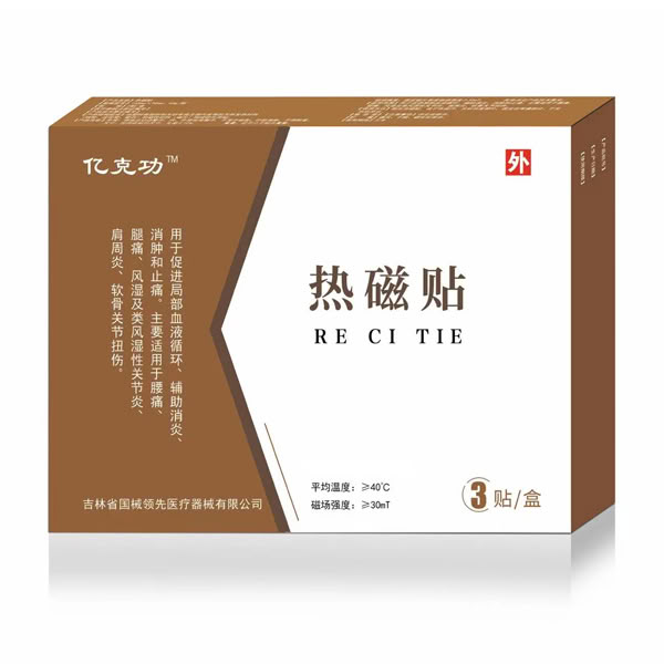 热磁贴产品说明书 【产品名称】热磁贴 【规格型号】①145mm×100mm,50g/贴 ②145mm×90mm,40g/贴 【医疗器械注册证编号】吉械注准20222090448 【产品技术要求编号】吉械注准20222090448 【生产许可证编号】吉药监械生产许20220020号 【结构及组成】由塑料袋密封和无纺布袋及袋内含有的天然发热材料(铁粉、活性炭、蛭石)和磁性材料(磁片)构成的外用贴。 【产品性能】 外观:样品应切边整齐,内、外袋包装整齐,不准许破裂;印刷清晰,不得脱落。 尺寸:应符合标示尺寸,允差±10%。 重量:应不小于标示重量。 磁场强度:固定磁片表面磁场强度≥30mT。 其他详见产品技术要求。 【适用范围】用于促进局部血液循环、辅助消炎、消肿和止痛。主要适用于腰痛、腿痛、风湿及类风湿性关节炎、肩周炎、软骨关节扭伤。 【使用方法】取出热磁贴,装于布袋内,无纺布面朝外,固定在疼痛部位。不发热后弃去。 【禁忌症】1.皮肤破损、开放性伤口、溃烂、感觉障碍、急性闭合性损伤、化脓性感染及急性期炎症患者,恶性肿瘤、活动性结核、精神类患者,皮肤病、严重糖尿病、高热患者及对产品材质过敏者、高热患者忌用,孕妇、婴幼儿使用遵医嘱。 2.慎用人群: 患有恶性肿瘤者、佩戴心脏起搏器者、合并有心脑血管、肝、肺、肾和造血系统等严重原发性疾病者;精神病患者;孕妇及哺乳期妇女;体质极度虚弱者、儿童及对温度变化不太敏感的患者。 【注意事项】 1、勿入口。 2、勿贴于皮肤,贴于内衣外侧,以免灼伤。 3、皮肤有出血点或溃烂现象禁用。 4、对温度不敏感者慎用。 5、若衣物有轻微着色,清水去除。 6、本产品一次性使用。 7、产品不能代替药物治疗;若配合药物使用,需咨询专业医生。 8、建议在清醒状态下使用,避免剧烈运动及睡眠中使用; 9、使用时应避免产品发生挤压; 10、在同一位置长时间使用,存在低温烫伤的风险。 【贮 藏】通风、干燥、避光处保存。 【产品批号】见包装盒 【生产日期】见包装盒 【失效日期】见包装盒 【使用期限】三年 【注册人/生产企业名称】吉林省国械领先医疗器械有限公司 【售后服务单位】吉林省国械领先医疗器械有限公司 【生产地址】长春市净月开发区新湖镇新兴村岭上屯 【住 所】长春市净月开发区新湖镇新兴村岭上屯 【邮政编码】130000 【说明书编制日期】2022年5月16日 更多 热磁贴 价格、说明、厂家,请关注医贸天下疗器械网