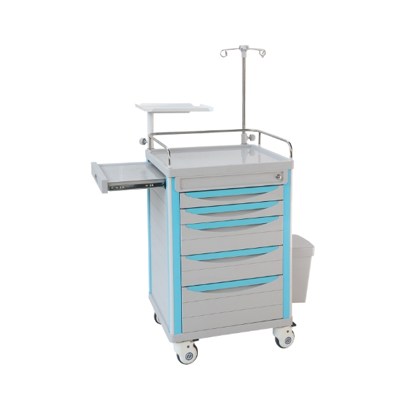 ABS抢救车参数: 车体尺寸:600*470*920mm ★1.适用于医护人员对病人急救护理换药等 ★2.主体用铝.钢.ABS全新料工程结构组成,四柱承重 ★3.优质的ABS工程塑料设计双层底面注塑工艺成型台面,凹陷设计可防止物品滑落,304不锈钢三面围栏,台面上配透明软玻璃, ★4.正面:中控锁,三折静音轨道,设计五层抽屉,分别为二小抽,(抽屉面高度是7公分).二中抽.(抽屉面高度是14公分,)一大抽(抽屉面高度是21公分).每层抽屉内有长宽各3*3的分格片,可自由分隔大小空间16个药盒,每层抽屉托盘ABS材质可取出方便清洗, 更多 ABS抢救车 价格、说明、厂家,请关注医贸天下医疗器械网