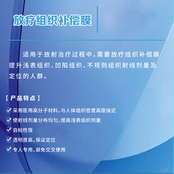 【使用范围】 1、对于浅表(肿瘤)靶区而言,无论是传统的电子线照射技术,还是适形调强X照射技术,都需要用到补偿物,增加皮肤浅表剂量。 2、传统照射,由于体表轮廓不规则而导致靶区剂量分布不均匀,皮肤表面剂量足及靶区漏照加入自粘性补偿物可以提高皮肤剂量, 减少空气间隙,使剂量分布均匀。 3、乳腺癌治疗后胸部照射采用调强技术,由于呼吸有3MM-4MM的呼吸动度,所以采用调强技术的患者需要加5MM-10MM左右的补偿 物,可以避免由于摆位或呼吸动度引起的误差及照射脱靶问题。切线照射也同样需要加入自粘性补偿物。 ▲自粘特性,贴合人体表面部位 ▲医用级高分子材料,生物相容性好 ▲使用方便,薄厚大小多种型号选择 ▲透明高清晰,确保准确定位 ▲单人使用,避免交叉感染 收费项目【是】 更多 放疗补偿定位膜 价格、说明、厂家,请关注医贸天下医疗器械网