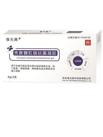 壳聚糖肛肠抗菌凝胶由壳聚糖肛肠抗菌凝胶和推注器(导入管)两部分组成。当壳聚糖肛肠抗菌凝胶在推注器(导入管)的配合下进入直肠后,逐渐溶化,在直肠部位形成一层保护膜,同时对致病微生物具有较强抑制作用。   【产品名称】壳聚糖肛肠抗菌凝胶   【商 品 名】俊元爽   【规 格】4g   【结构组成】由壳聚糖、卡波姆、纯化水制成的水溶性凝胶和医用高分子材料制成的推注器组成;或由壳聚糖、卡波姆、纯化水制成的水溶性凝胶和药用铝(塑)管加导入器组成。   【适用范围】用于改善内痔及混合痔引起的痔疮出血、肛门坠胀、痔核脱垂、痔粘膜充血水肿症状及缩小痔核。   【禁 忌 症】1、对本品过敏者禁用;   2、孕妇及哺乳期妇女慎用;   3、使用本品期间,禁忌辛辣食物。   【注意事项】1、直肠外用,严禁口服。   2、产品无菌,如果外包装破裂,请勿使用。   3、本品为一次性使用产品,使用后销毁或丢弃。   4、使用过程中有少量胶状物流出属正常现象。   5、使用过程中出现任何不适,应停用本品,立即就医并告知我公司。   6、请不要与其他医疗器械联合使用。   7、若与其他治疗手段或药物共同使用,请咨询专业医生。   8、使用本品时,应将壳聚糖妇用抗菌栓剂推入阴道深部。   9、请在产品有效期限内使用。   10、请勿放置于儿童可接触的地方。   【用法用量】每晚睡前先将肛门洗净,去除推注器前端的保护帽,将装有凝胶的推注器缓慢推入直肠深部,利用推注杆将凝胶推入直肠后,撤出推注器。每日一次,每次3-6g,7天为一个疗程。   【无 菌】经Co60辐照灭菌,产品无菌。   【包 装】铝塑复合(或高低压聚乙烯)袋包装,1支/袋;   【贮 藏】遮光,密闭,置阴凉干燥处。   【有 效 期】二年   【生产批号】见包装盒   【生产日期】见包装盒   【有效期至】见包装盒   【注册证编号】辽械注准20172640185   【技术要求编号】辽械注准20172640185   【生产许可证号】辽食药监械生产许20150080号      更多 壳聚糖肛肠抗菌凝胶 价格、说明、厂家,请关注医贸天下医疗器械网