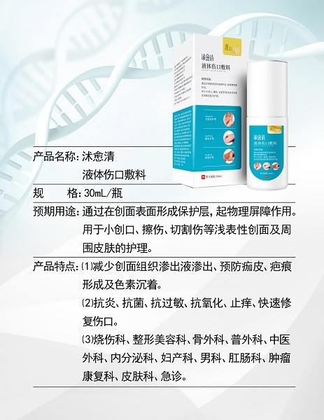 2020文号,全科适用, 减少组织渗出液渗出,预防痂皮,疤痕开成及色素沉着,抗炎 、抗菌 抗过敏 抗氧化 止痒 快速修复创口 更多 液体敷料(可OEM代加工) 价格、说明、厂家,请关注医贸天下医疗器械网