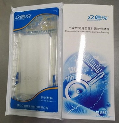 产品包装:内包装阴阳镀铝袋,外包装纸盒   产品型号:ZXK-A2;ZXK-A3 ; ZXK-A4   产品规格:20cm*10cm*1cm;15cm*10cm*1cm;10cm*10cm*1cm   产品原理:一次性使用负压封闭引流护创材料是在引流管外用负压引流管医用泡沫包裹,是泡沫材料成为引流管和被引流腔隙或创面间的中介,引流管外接冲洗管路,再利用具有生物阀功能的半透性粘贴薄膜封闭被引流区,使之与外界隔绝,接通高负电源,形成一个高效引流系统,及时清理被引流区的渗出物。   产品适用科室:   涵盖创伤骨科、烧伤科、普外科、整形外科等多科室。                      更多 一次性使用负压引流护创敷料 价格、说明、厂家,请关注医贸天下医疗器械网