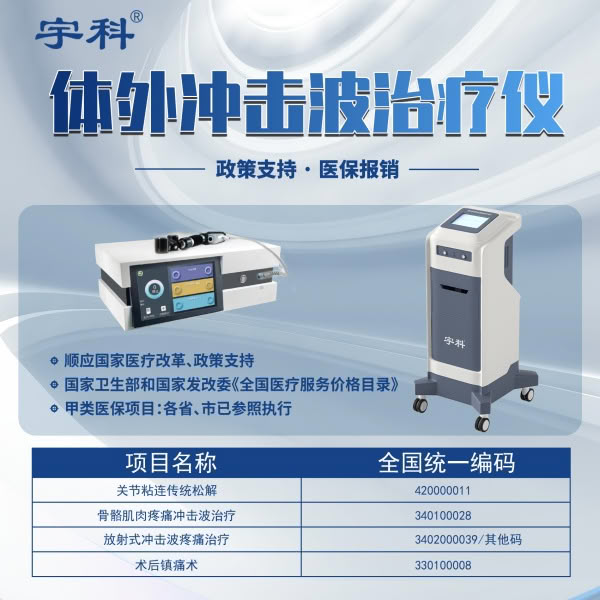 做康复找宇科集团-对外承接OEM贴牌代加工业务,大型GMP车间,10万级净化标准,严格执行质量标准,24小时出样。 宇科一二类医疗器械专业制造商: 研发-生产-销售-贴牌-代加工-OEM 越了解宇科?,越信赖 宇科?,专业医疗制造商! 源头厂家直销、独立包装、货真价实、军工品质,疗效明显! 宇科?您正确的医疗选择!全国挂网、诚信合作、携手宇科、共创辉煌! 【部分设备耗材】:中医定向透药治疗仪、超声脉冲电导透药治疗仪、超声脑血管治疗仪、子午流注治疗仪、脑循环功能障碍治疗仪、经颅磁电治疗仪、超声导入仪、超声波治疗仪、胃肠动力治疗仪、神经肌肉电刺激、中频治疗仪、低频脉冲、隔物灸治疗仪、智能电针治疗仪、空气压力波治疗仪、温针电针仪、中风偏瘫治疗、中频立体干扰电仪、多功能妇科仪、理疗电极片、定向治疗电极、医用超声耦合贴片、穴位压力刺激贴、理疗用体表电极、明目视力眼贴、等更新中··· 所有医疗器械产品,军工品质,全国挂网销售、源头厂家、质优价廉,研发-生产-销售-代加工,政策支持,医保报销,支持试用,详情请联系各区域销售经理。 宇科新一代体外冲击波治疗仪是一种通过物理学机制介质传导的机械性脉冲压强波,将设备产生的脉冲超声波转换成精确的弹道式冲击波,通过治疗探头的定位和移动,引起传导介质的压强、温度、密度等物理性质发生跳跃式改变,可以对疼痛发生广泛的人体组织效应,促进组织细胞代谢和活化,达到治疗疼痛和促进组织康复的良好效果。被众多专家推崇为“非手术治疗疼痛安全守护的一道防线”! 设备组成:主机、电源线、控制手柄、治疗头、(1套、2套)。 更多 做康复找宇科厂家便携式气压弹道式体外冲击波治疗仪专用医用超声耦合贴片专家 价格、说明、厂家,请关注医贸天下医疗器械网