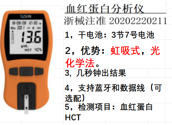 1,光化学法,虹吸式(不需要移血管)操作简单。 2,五秒出结果 3,三节7号干电池 4,支持蓝牙和数据线传输(选配) 更多 血红蛋白分析仪(光化学,虹吸) 价格、说明、厂家,请关注医贸天下医疗器械网
