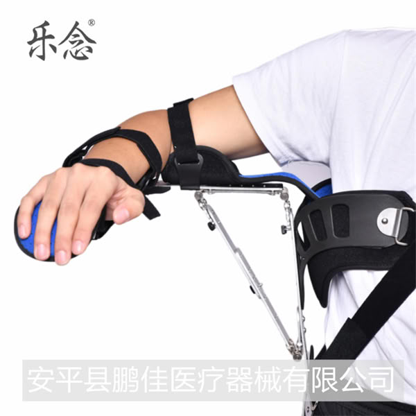 『产品类别』:可调式固定支具 『产品名称』:可调肩外展固定支具I型『产品规格』:均码左、右)『适用范围山:适用于肩关节术后固定、脱位整复后固定,脑骨骨折合并神经损伤、肩关节部位骨折时的功能位固定。『产品用途』:此产品名为肩外展固定支具又称肩外展支架,是一种静态固定式肩关节固定器,其特点是可将肩关节固定在外展、前屈、内旋和肘关节屈曲、腕关节功能位。产品特性:设计造型美观,质里轻,功能稳定,穿戴便捷。可根据医师需求调整肩关节屈曲,外展角度。使肩关节保持在70-90度,使肘关节屈曲40-90度。使腕关节及掌指关节保持在功能位并使其免负荷,上肢长度可以进行微调。『装配需知』: 1.应在医师指导下,按患者身高适当调节腋下支条的长度,然后束牢胸廓带、髂嵴带和肩背带,以良好的支撑和免荷。 2.按患者的臂长调节固定器上臂支条和前臂支条的长度,使肘关节和腕关节处于正确位置,然后扎好上臂固定带和前臂固定带。 3.通过调节腋下斜拉支杆的长度或肩外展内收调节盘,确定肩外展的角度;通过调节肘关节调节盘确定肘屈曲角度。                      更多 可调肩外展固定支具支架矫形器肩关节肱骨手臂骨折术后康复固定 乐念 鹏佳医疗 价格、说明、厂家,请关注医贸天下医疗器械网
