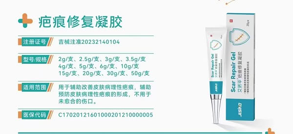 Scar Repair Gel艾诺平 疤痕修复凝胶外使用说明书 【产品名称]疤痕修复凝胶[型号、规格]20g/支 【结构及组成]由硅酮凝胶(硅酮、卡波姆、甘油、三乙醇胺、纯化水)和凝胶管(PE材质)构成。[产品性能]颜色应为白色或微黄色、质地均匀,无不可溶性异物。凝胶管:外形应端正,无 明显的变形和残缺;表面应光滑,无锋棱、毛刺。pH值:应为4.0~7.0。其他内容详见产品技术要求。 【适用范围]用于辅助改善皮肤病理性疤痕,辅助预防皮肤病理性疤痕的形成,不用于未愈 合的伤口。 【使用方法]用清水洗净疤痕处,拈干水分后,取适量本品涂于疤痕区,用消毒棉签抹匀,并 按摩疤痕区,每天2-4次或遵医嘱。 [禁忌症]禁用于感染、溃疡或糜烂性伤口。 【注意事项]1.每次使用前清洁使用部位皮肤表面,破损处严禁使用; 2.本品仅供外用,伤口愈合后方可使用,不可口服; 3.勿直接用于眼和耳: 4.应放在儿童不宜接触到的地方; 5.本品尚未发现有不良反应,使用时如因个体差异产生不良反应,应及时就诊。 【特殊储存、运输条件、方法]密闭、常温贮存,运输避免暴晒、雨淋。[产品批号/生产日期/失效日期]见包装盒[使用期限]三年 更多 医用硅酮疤痕修复凝胶 价格、说明、厂家,请关注医贸天下医疗器械网